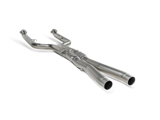 Constructed from high-grade lightweight titanium, this set has been developed to be combined with the Akrapovic Slip-On Line (Titanium) exhaust and increase performance. The X-connection, allowing gases from both sides of the engine to mix in a unique symphony, is cast at the in-house titanium foundry. The set delivers a weight reduction of 72.6% (19.56 kg) compared to the standard stock part. When combined with the Slip-On Line (Titanium) exhaust system, power gains of 8.5 kW (11.5 hp) at 6,150 rpm and torque increases of 15.6 Nm at 2,550 rpm have been achieved when tested on the Akrapovic dyno against a BMW M5 with a standard stock exhaust.